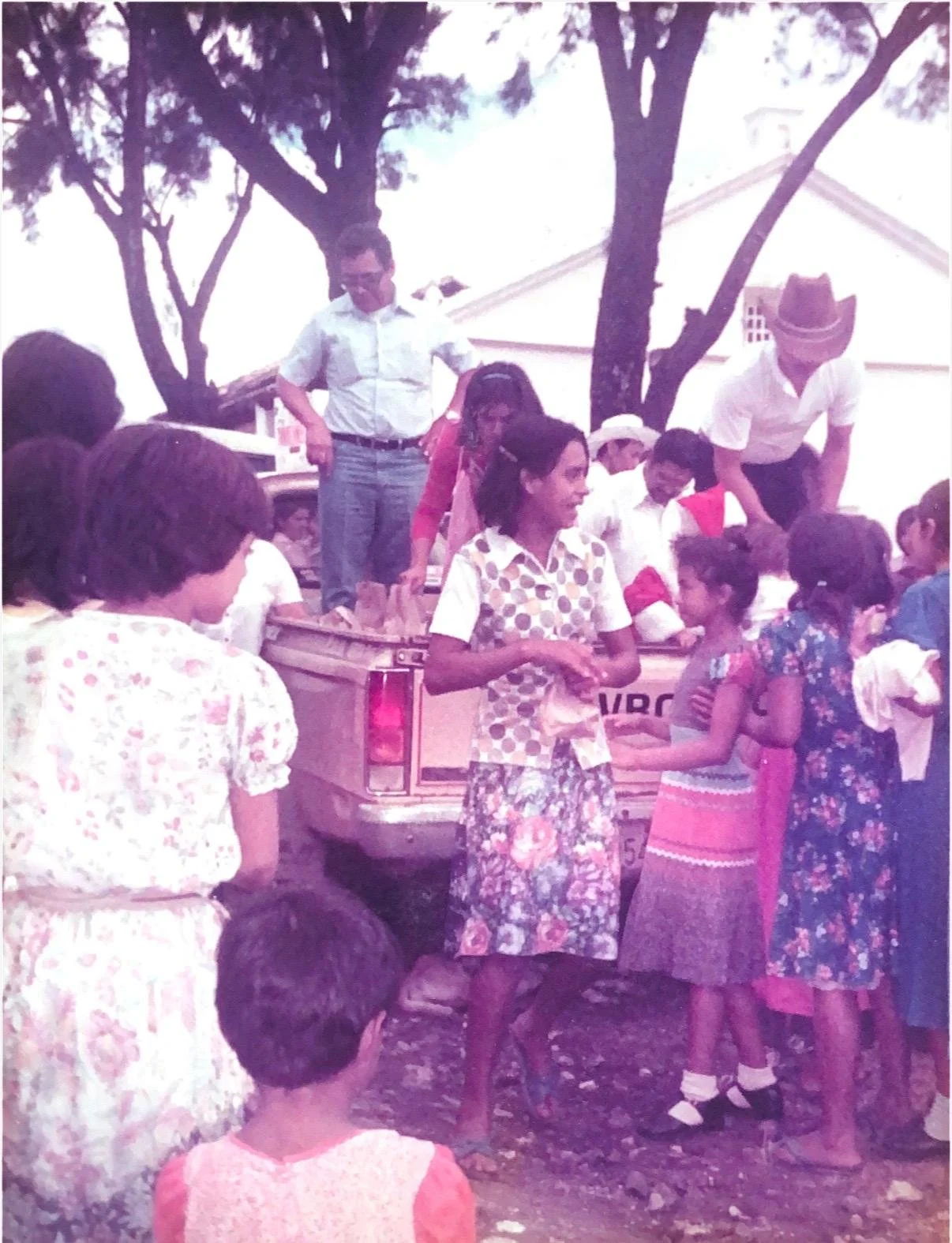 San Buenaventura, circa 1985. My father (blue shirt) handing out Christmas apples from the back of his pickup truck. Kids would line up at dawn, waiting for their gift from Don Carlitos.